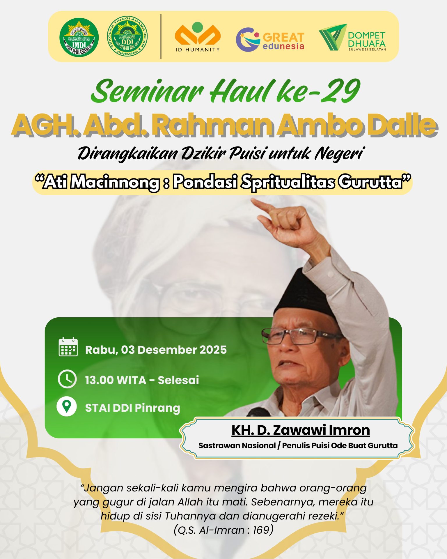 Peringatan haul tahun ini terasa istimewa dengan kehadiran Tokoh Sastrawan Nasional, K.H. D. Zawawi Imron, yang akan membawakan hikmah dan tausiyah khusus. Sosok yang dikenal sebagai “si Celurit Emas” ini diharapkan memberikan perspektif spiritual dan sastra yang memperkaya pemahaman jamaah tentang perjalanan keilmuan dan keteladanan AGH. Abd. Rahman Ambo Dalle.